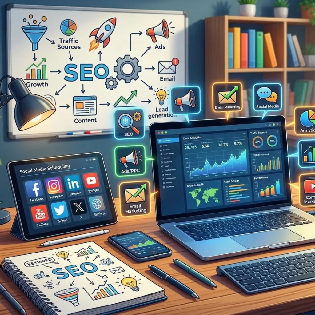 Digital marketing is based on SEO. It assists companies in being visible in search engines and achieving organic traffic.